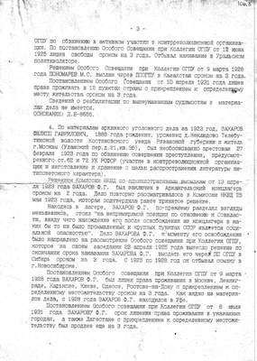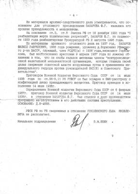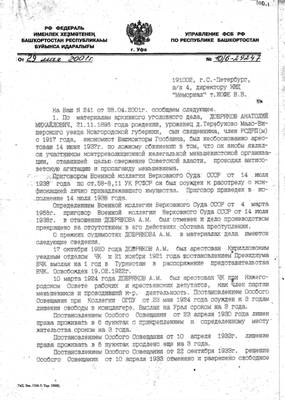 100. Letter from the Federal Security Service of the Russian Federation for the Republic of Bashkortostan No. 10/6-29247 dated 05.29.2001 to the director of the Memorial Research Center V.V. Iofa (response to request No. 241 dated 04.28.2001) with archival information about A.M. Dobryakov, A. Zhdanov. P., Ponomarev M.S., Zakharov F.G., as well as the lack of information about Sokolinsky L.Ya.