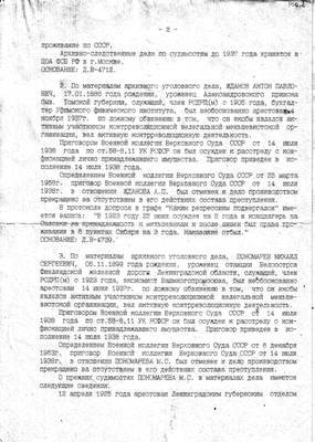 Genus. 05.11.1899 in Beloostrovskaya parish. Petersburg province; Russian; higher education; member of the RSDLP(M) since 1923. In 1925 he lived in Leningrad, worked as a teacher of general education courses at the Union of Garment Workers. Arrested 04/12/1925. Sentenced to OS at the Kogpu on June 12, 1925 under Art. Art. 62 and 68 of the Criminal Code to imprisonment for 3 years. In conclusion - in the Ural political isolation ward. Being a prisoner, he was sentenced by the OS at the Kogpu on 03/09/1928, after serving his sentence, to deportation to Kazakhstan for 3 years. The OS at the Kogpu was sentenced on April 10, 1931 to deprivation of the right to reside in 12 localities with attachment to a specific place of residence for 3 years. In 1937 he lived in Ufa, worked as an economist at the Bashmnogopromsoyuz. Arrested 14.06. 1937. Sentenced by a visiting session of the Supreme Commissariat of the USSR Armed Forces on July 14, 1938 to military service with confiscation of property. Rehabilitated in the 1937 case by the Supreme Court of the USSR Armed Forces on December 6, 1963, in the 1925 case by the St. Petersburg Prosecutor's Office. 09/14/1995.