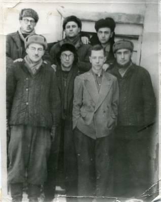 22. Photo of prisoners 11 l/o Dubravlaga. 1st row (from left to right): Partashnikov A., Pustyntsev B., Gudzenko R., Krasilnikov M.; 2nd row: Feldman A., Rubin A., Kozovoy V. Winter 1959