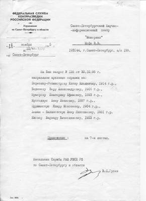 56. Covering letter of the UFSK of the Russian Federation for St. Petersburg and the region No. 10/41-3377 dated 11/28/1995 (to No. 128 dated 10/30/1995) on sending archival certificates at the request of the Memorial Research Center to Iofe V.V. on Berezina-Rotmistrova E.I., Vedeneva V.A., Numerova E.E., Musselius A.I., Pruzhanskaya K.M., Leman-Balanovskaya I.N., Ezhover V.V.