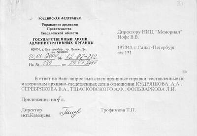 3.1. Letter No. 02-08-222 of May 10, 2000 from the State Archive of Administrative Bodies of the Department of Archives of the Government of the Sverdlovsk Region to the Director of the Memorial Research Center V.V. and Folvarkova L.I.