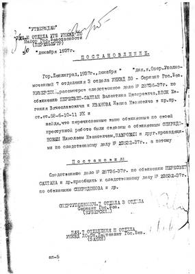 017. Resolution of the deputy head of the department of the UGB UNKVD LO dated December 10, 1937 on joining the investigative case No. 23532-37 on charges of N.I. Spiridonov. investigative case No. 28736-37 on charges of Peresvet-Saltan V.Ts., Blok E.V. and Ivanova I.I.
