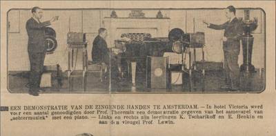– In hotel Victoria werd voor een aantal genoodigden door Prof. Theremin een demonstratie gegeven van het samenspel van “aehtermuziek” met een piano.