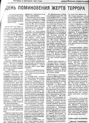 2. Article by Bolonkin A.A. “Day of Remembrance for Victims of Terror” in the newspaper “New Russian Word” dated 09/06/1991.