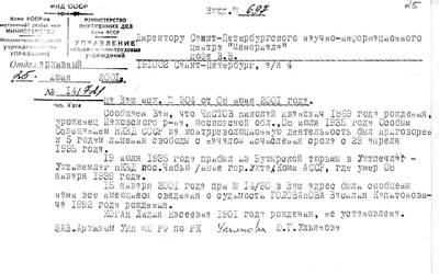 23. Letter from the Institute of Technical Institutions of the Ministry of Internal Affairs of the Komi ASSR No. 14/721 dated June 25, 2001 to the director of the Memorial Research Center V.V. Iofa (response to request No. 304 dated June 8, 2001) with archival information about N.I. Chistov. Information about Golovanovoe V.K. were provided in a letter dated January 15, 2001. Information about Kogan L.E. not available.