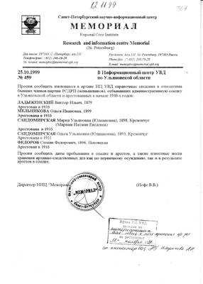 287. Letter from the Information Center of the Internal Affairs Directorate of the Ulyanovsk Region dated 12.11.1999 to the Director of the Research Center "Memorial" V.V.