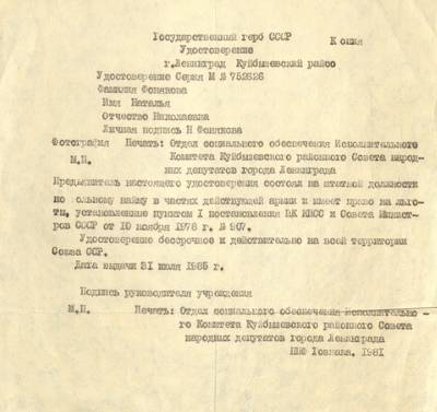 1. A copy of certificate No. 752626, issued by the Social Security Department of the Executive Committee of the Kuibyshev District Council of People's Deputies of Leningrad on July 31, 1985 to N.N. Fonyakova, on the right to benefits, as she held a regular position on a voluntary basis in units of the active army.