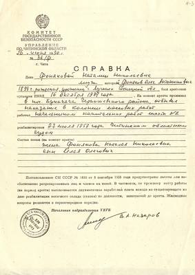 3. Certificate of the UKGB of the USSR for the Chita Region No. 36/F dated 16.06.1990, issued to N.N. Fonyakova, on the right to benefits for unjustifiably repressed persons and members of their families, provided for by the Resolution of the USSR Council of Ministers No. 1655 dated 08.09.1955.