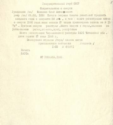 6. A copy of the death certificate I-SP No. 478871 of Fonyakov O.A. on 02/05/1938 (cause of death - execution, place of death - not indicated), issued by the Chernyshevsky District Civil Registry Office of the Chita Region on 06/27/1990.