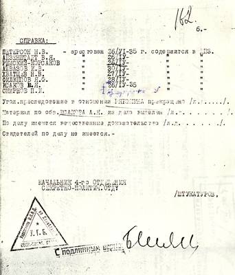 14. Certificate about the dates of arrest and places of detention of arrested participants in the case of former students of Petershule, compiled by an employee of the NKVD LO in 1935 [sheet arch. cases –162].