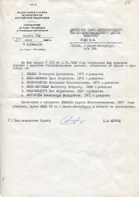 50. Letter No. 20/44-105 dated 07/20/1998 (reply to No. 105 dated 06/02/1998) from the Federal Security Service Directorate for St. Petersburg and the Leningrad Region to the Director of the Research Center "Memorial" Iof V.V. on sending archival certificates to Shebeko P.D., Shein-Lipman Yu.P., Shelkovnikov V.V., Shenk-Sergeeva V.P., Shidlovitsky Sh.A., Shingarev A.F. and about the lack of information on Shembel B.K.