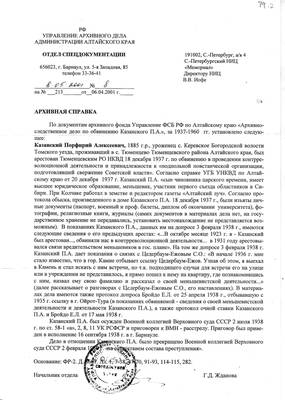 79.2. Archival certificate of the special documentation department of the Archives Department of the Administration of the Altai Territory No. 8 dated 05/08/2001 on Kazansky P.A.