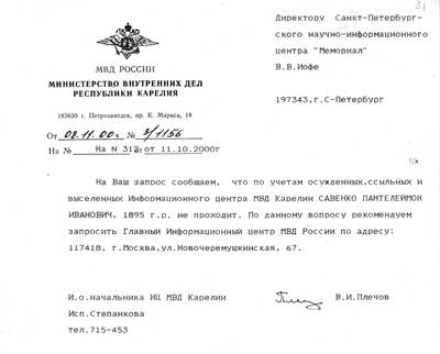 44. Letter from the Information Center of the Central Internal Affairs Directorate of the Krasnoyarsk Territory No. 1/3-2187 dated 04/05/2001 to the director of the Memorial Research Center V.V. Iofa (response to request No. 060 dated 01/09/2001) with an archival certificate to P.I. Savenko.