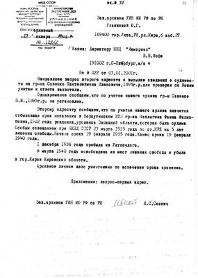 4.2. Request from the Research Center "Memorial" to the Information Center of the Internal Affairs Directorate for the Arkhangelsk Region. No. 021 dated 01/03/2001 at the Memorial Research Center about Savenko P.I.