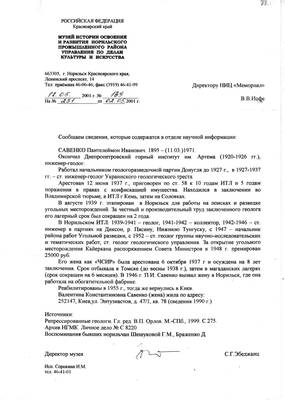 88.1. Letter from the Museum of the History of the Development and Development of the Norilsk Industrial Region of the Department of Culture and Art of the Krasnoyarsk Territory No. 139 dated 05/18/2001 to the director of the Memorial Research Center V.V. Iofa (response to inquiries No. 251 dated 05/02/2001) with archival information about Savenko P .AND. and with a card from the museum’s factual card index.