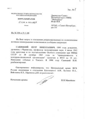 11. Letter from the Central Election Commission of the FSB of the Russian Federation No. 10/A-4424 dated December 13, 2000 to the director of the Memorial Research Center V.V. Iofa (response to request No. 320 dated November 9, 2000) with archival information about P.N. Savitsky, as well as the lack of information about Bukovetsky A.I., Butenko V.A., Veigelin K.E. and Efremov D.V.