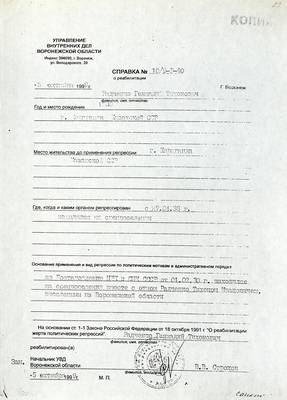 31. Certificate of the Voronezh Region Department of Internal Affairs No. 10/9-R-40 dated 10/05/1999 on the rehabilitation of T.I. Radchenko, who was exiled in 1931 together with his father T.I. Radchenko to the Karaganda Region.