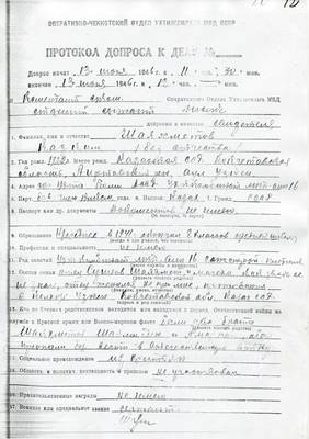 9. A certified copy of the interrogation report of K. Shayakhmetov from June 13, 1946, in the operational department of the Ukhtizhemlag of the Ministry of Internal Affairs, by the Information Center of the Ministry of Internal Affairs of the Komi Republic; f. 60, op. 14p, d. 940, l. 10-12.