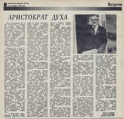 002. Aristocrat of the Spirit. Maxim Ageyev // Molodoy Leninets No. 38. September 16, 1989. The hero of the publication is Shifris Solo Germanovich