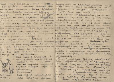 238. A letter from T.I. Myagkova, dated October 18, 1935, from the Verkhneuralsk detention center to her daughter, R.M. Poloz, about how, after hearing the news about her daughter's ballet classes, she decided to draw a Matryoshka doll dance; about how, when they live together, they will do exercises every morning; about the large number of spelling errors in the last letter and the need to focus on studying; about sending Marshak's poems, cut out from the Izvestia newspaper, with a request to learn one of them; about continuing to study geography; about plans to arrange her daughter's letters chronologically, noting how they change over time, and how interesting it will be for her to look at them when she grows up; with charades and drawings; with censored deletions.