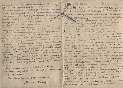 32. Letter from T.I. Myagkova, dated May 6, 1933, from the Verkhneuralsk detention center to her mother and family about receiving a May Day message from them, about the cold cell and the warm clothes she never takes off, about the letters she sent them, about the beautiful view from her cell window and the fresh air, about dreams in which she sees her husband, daughter, and mother, about necessary things, about not yet being able to write to her daughter but very much wanting to receive detailed letters about her, about where she will celebrate her birthday on June 12th, and with a request to buy her something from her mother. (Part of the letter is missing)