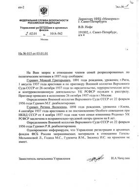 19. Letter from the FSB Directorate for Moscow and the Moscow Region. No. 6/2312 dated March 22, 2001 to the Memorial Research Center (response to request No. 169 dated March 13, 2001) to send a request about I.S. Ziskina. to the State Archive of the Russian Federation.