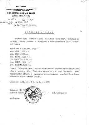 81.2. Archival information from the Information Center of the Central Internal Affairs Directorate of the Perm Region. No. 10/3-584 dated 05/11/2001 about the Mazur family, deported in February-March 1940 to the territory of the Perm (at that time Molotov) region.