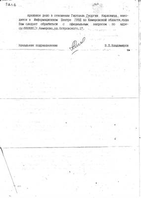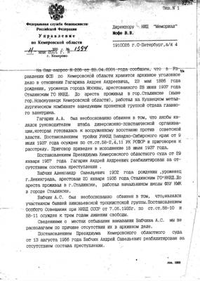 82. Letter from the FSB Directorate for the Kemerovo region. No. 1394 dated May 11, 2001 to the director of the Memorial Research Center V.V. Iofe (response to request No. 236 dated April 28, 2001) with archival information about A.A. Gagarin. and Babchin A.S., and also that the archival file regarding Girtzel G.K. located in the Information Center of the NUVD of the Kemerovo region.