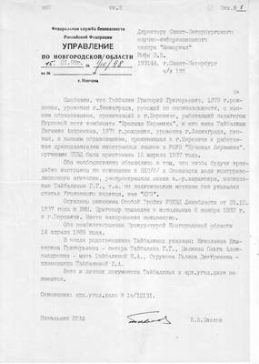 17. Letter of the Federal Security Service of the Russian Federation for the Novgorod Region No. 1/10/98 dated January 15, 1999 to the Director of the Memorial Research Center Iofe V.V. (response to request No. 300 dated 12/22/1998) with information about Taybalin G.G. and Taybalina E.A.