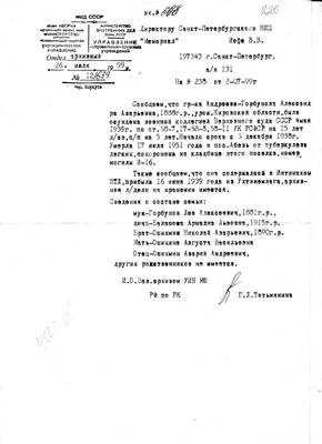146. Письмо УИН МЮ РФ по Республике Коми №12/639 от 26.07.1999 директору НИЦ "Мемориал" В.В.Иофе (ответ на запрос №238 от 02.07.1999) с архивными сведениями об Андреевой-Горбуновой А.К.