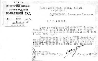 4. Справка Ленинградского областного суда №44-У-0107 от 05.07.1957г. об отмене постановления тройки УНКВД Ленобласти от 20.11.1937г. в отношении Негоновского Т.А. и о его реабилитации Леноблсудом 01.07.1957г.