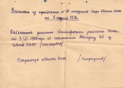 4. Выписка из протокола № 10 заседания бюро Обкома КПСС от 08.04.1958 об отмене решения Октябрьского райкома КПСС от 03.06.1938 об исключении Топузиса из членов КПСС (посмертно).