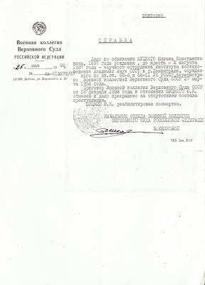 2. Справка Военной Коллегии Верховного Суда СССР №4н-010698/55 от 25.04.1991г. об отмене приговора Военной коллегии от 29.05.1940г. и о его реабилитации Военной Коллегии Верховного Суда СССР 06.08.1955г.