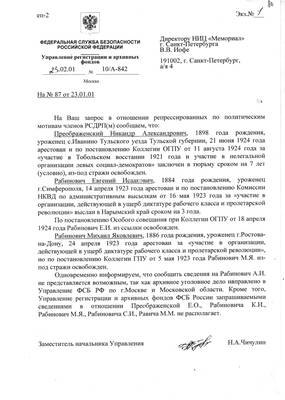 80. Письмо Управления регистрации и архивных фондов ФСБ РФ №10/А-842 от 23.02.2001 директору НИЦ «Мемориал» В.В.Иофе (ответ на запрос №87 от 23.01.2001) с архивными сведениями о Преображенском Н.А., Рабиновиче Е.И. и Рабиновиче М.Я., а также о том, что сведения на Рабиновича А.И. сообщить не представляется возможным, т.к. его архивное уголовное дело направлено в УФСБ РФ по Москве и МО, и об отсутствии сведений о Преображенской Е.О., Рабиновиче К.И., Рабинович М.Я., Рабиновиче С.И. и Равиче М.М.