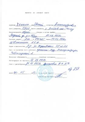 5. Выписка из домовой книги о регистрации Хенкина Е.А. по адресу: Ленинград, ул. Жуковского, д. 32 , кв. 22, с 12.09.1937, 21.11.1937 снят с регистрации в связи с арестом НКВД, выданная Жилищным агентством Центрального района Санкт-Петербурга 30.05.2013.
