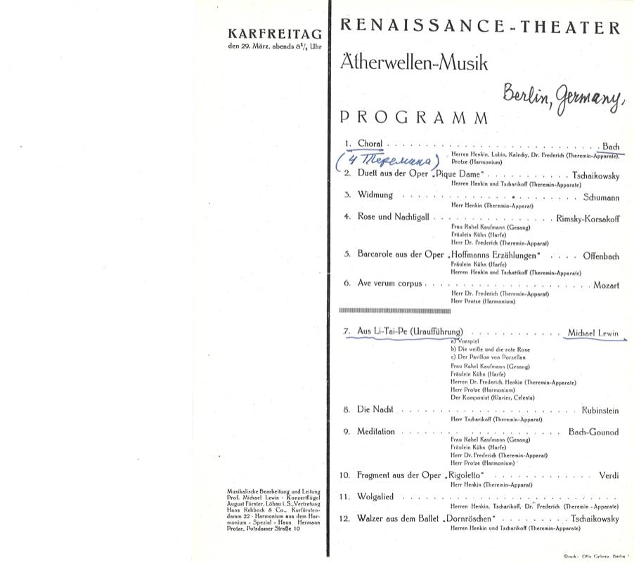 2. Программа концерта «Эфирная музыка» в Ренессанс-театре с участием Хенкина Е.А., Берлин, [29.03.1927 или 29.03.1935].