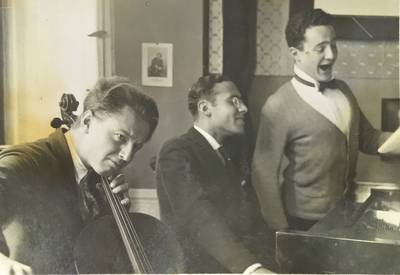 Слева и справа - его ученики К. Чарикофф и Е. Хенкин, а за роялем - профессор Левин.