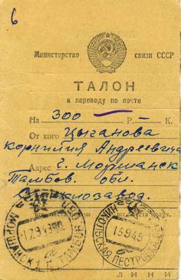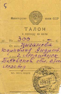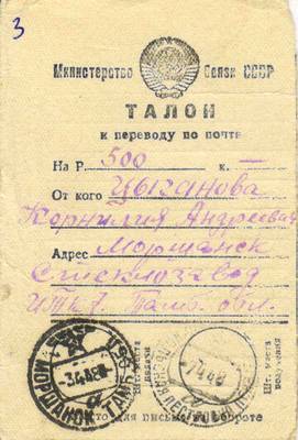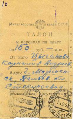 132. Талон к переводу 500 рублей от Цыганова К. А. из г. Моршанска Тамбовской области, стеклозавод, ИТК № 7, жене Цыгановой А.И., на обороте – письмо о своей радости, что может помочь хоть чем-то и о том, что из-за весенней распутицы завод остановят; п/ш 03.04.1948/07.04.1948.