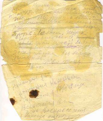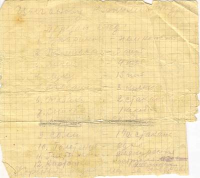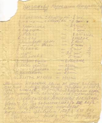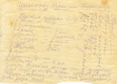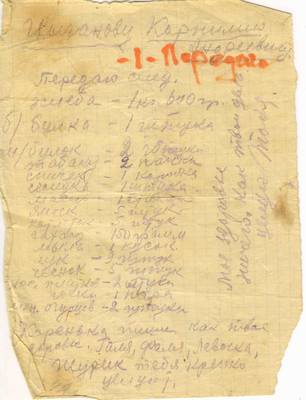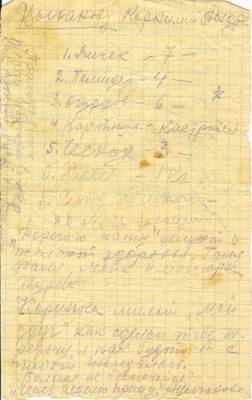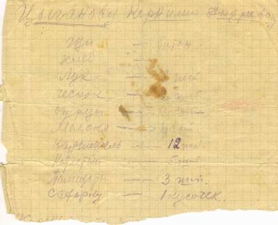 34. Опись передаваемых продуктов Деминой Л.Г. в тюрьму Цыганову К.А. с ее запиской о том, что все продукты она получила в посылке от его жены, на обороте - приписка Цыганова К.А. от 01.11.1942 о получении передачи и о своей благодарности.