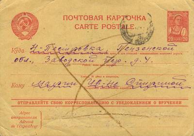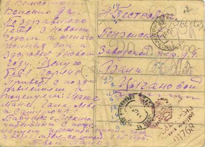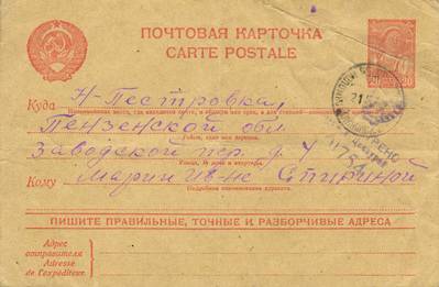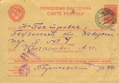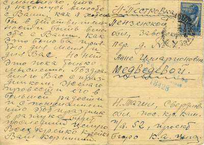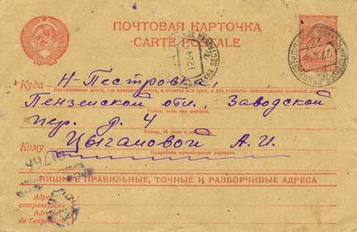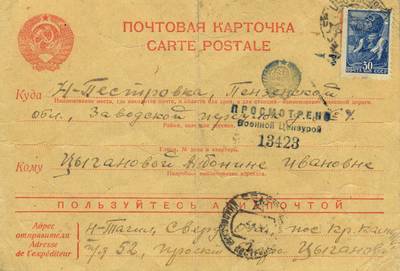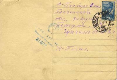 108. Письмо Цыганова К.А. от 19.04.1945 со ст. Академическая Октябрьской железной дороги (на почтовой карточке) Спириной М.И. о получении сразу трех ее писем, об отсутствии бумаги и конвертов, о его назначении начальником производства и о назначении директором завода их знакомого, жителя с. Н. Пестровки Пентко Н.А.; со штампом «Проверено военной цензурой 01754»; п/ш 21.04.1945/отсутств.