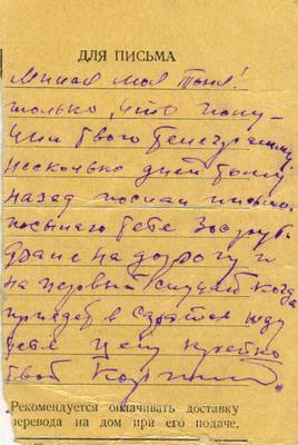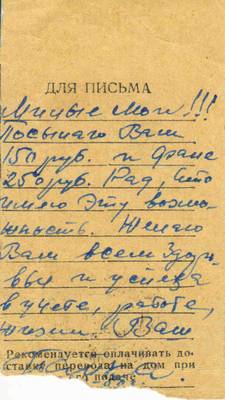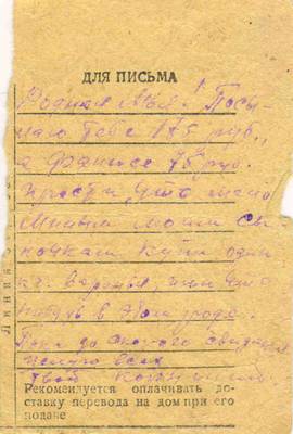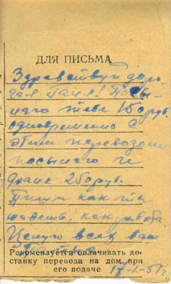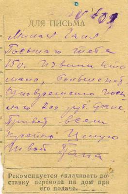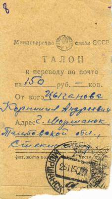 136. Талон к переводу 150 рублей от Цыганова К. А. из Моршанска Тамбовской области, стеклозавод, дочери Цыгановой Г.К., на обороте – письмо с извинениями, что посылает так мало и о переводе дочери Фале 200 рублей; п/ш 02.11.1950/05.11.1950.