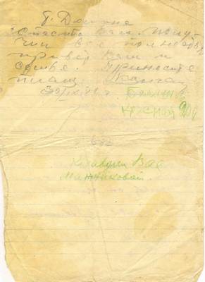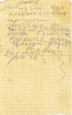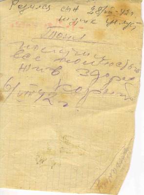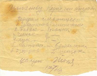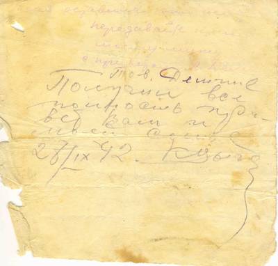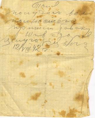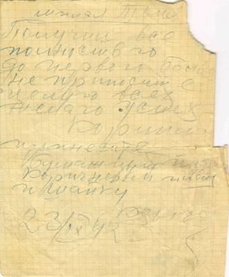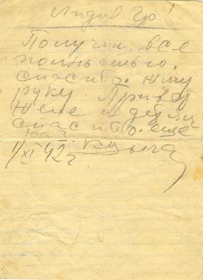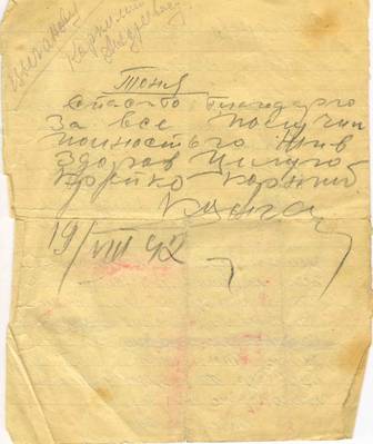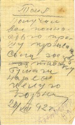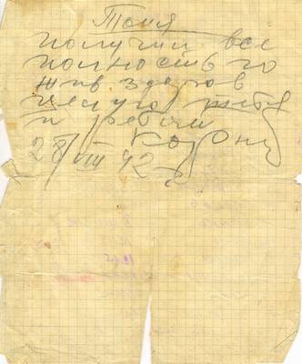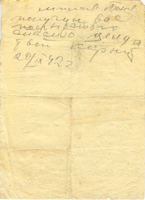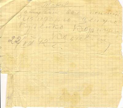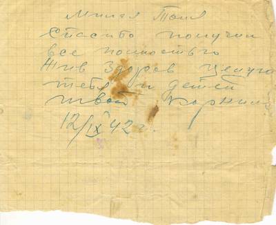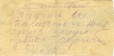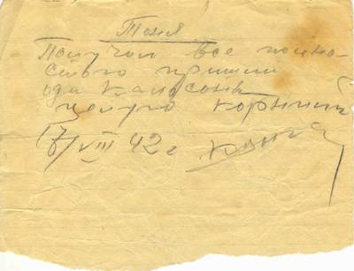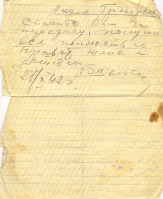 28. Записка Цыганова К.А. от 21.09.1942 жене Цыгановой А.И. о получении передачи от нее.