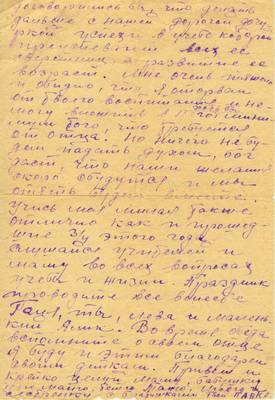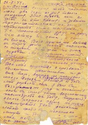 72. Письмо Цыганова К.А. от 28.07.1944 из пос. Красный Камень, г. Нижний Тагил Свердловской области, сыну Цыганову А.К., которому исполнилось 2 года, с поздравлениями с днем рождения и с просьбой молиться за его освобождение, чтобы они смогли впервые увидеть друг друга.