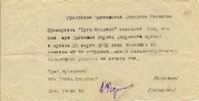 7. Письмо промартели «Путь Сталина» (после 23.03.1952) Цыгановой А.И. о том, что Цыганов К.А. прибыл в артель 23.03.1942 и до отправки его в Большемуртинскую больницу, не работал в артели ни дня.