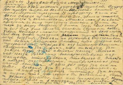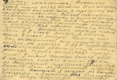88. Письмо Цыганова К.А. от 06.11.1944 из пос. Красный Камень, г. Нижний Тагил Свердловской области (на почтовой карточке) жене Цыгановой А.И. с поздравлениями с 7 ноября и о желании быть с ними рядом в этот день; со штампом «Проверено военной цензурой 13441»; п/ш 14.11.1944/отсутств.