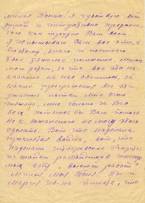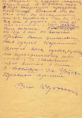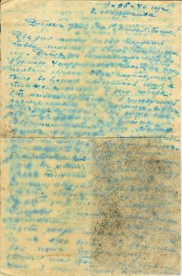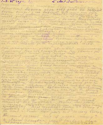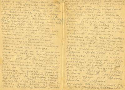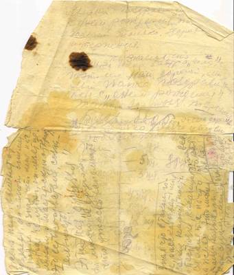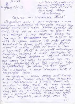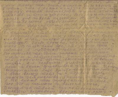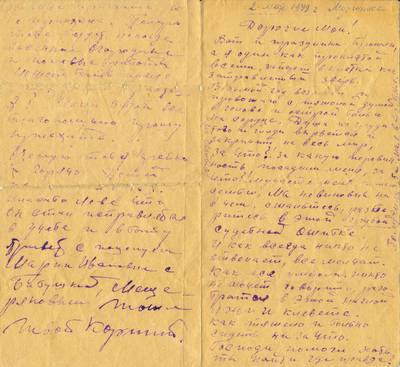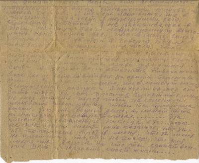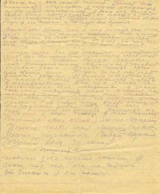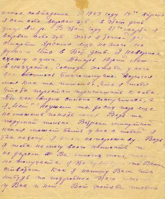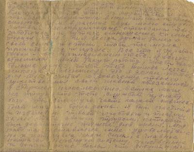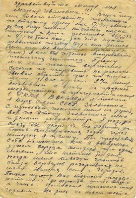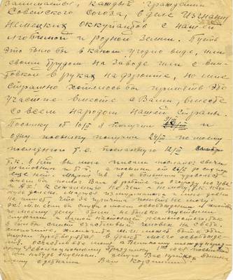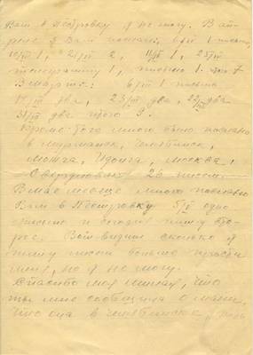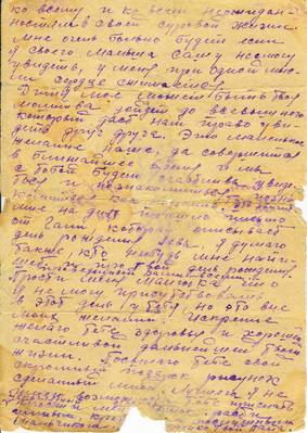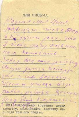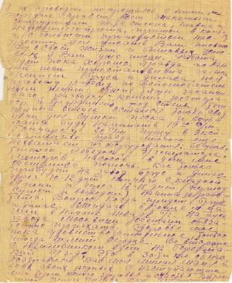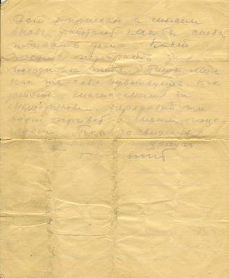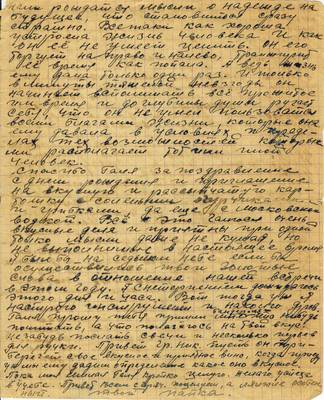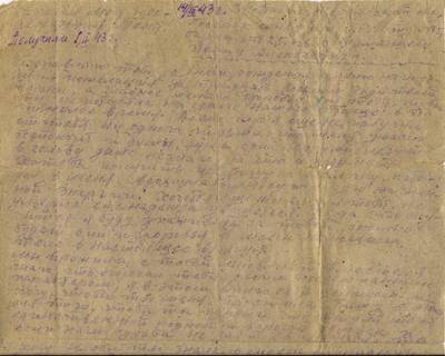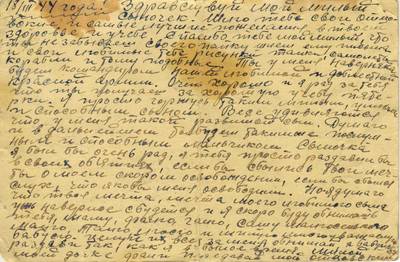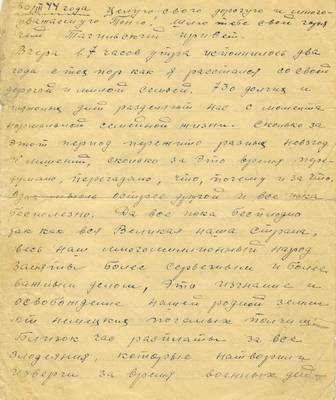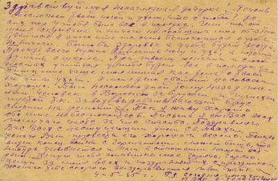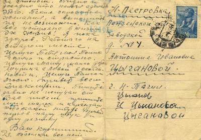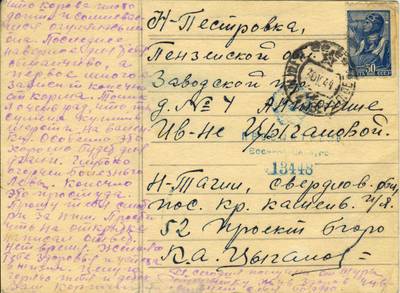 41. Письмо Цыганова К.А. от 13.04.1943 из г. Нижнего Тагила Свердловской области жене Цыгановой А.И. о своем беспокойстве по поводу отсутствия писем в течение 5 с половиной месяцев, о радости от полученной от племянницы Люси открытки, о том, что не нужно присылать денег, об огорчении от того, что посылки на почте не принимают, с просьбой к (сестре ?) Шуре приехать на свидание, об отправке очередного прошения о помиловании в марте 1943; с припиской «Получено 28 апреля».