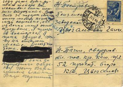 86. Письмо Цыганова К.А. от 01.11.1944 из пос. Красный Камень, г. Нижний Тагил Свердловской области (на почтовой карточке) жене Цыгановой А.И. о получении хороших известий от родни из Мурманска; со штампом «Проверено военной цензурой 21502»; п/ш отсутств./отсутств.