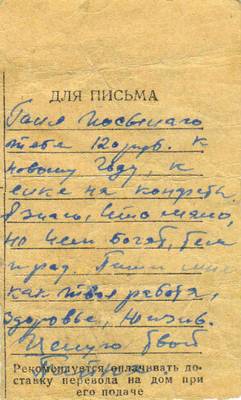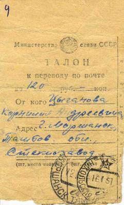 138. Талон к переводу 120 рублей от Цыганова К. А. из Моршанска Тамбовской области, стеклозавод, дочери Галине в Никольскую Пестровку Пензенской области, на обороте – письмо об отправке этих денег к Новому году; п/ш 12.01.1951/16.01.1951.