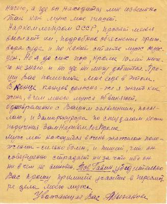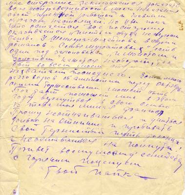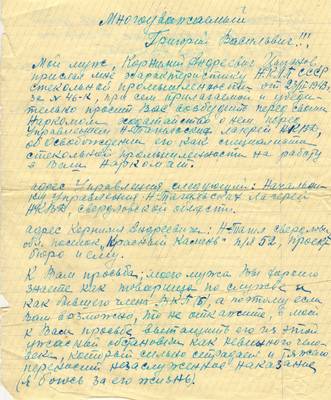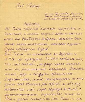 4. Заявление Цыгановой А.И. от [1943 г.] на имя тов. Гавина с просьбой помочь ей получить копию приговора, по которой осужден ее муж Цыганов К.А., и принять участие в пересмотре его дела.