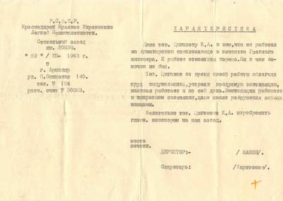 6. Характеристика, выданная Цыганову К.А. руководством Стекольного завода им. Ломзы, г. Армавир, 23.12.1943, о его положительной работе в качестве главного инженера и о том, что желательно «перебросить» Цыганова К.А. на завод главным инженером.